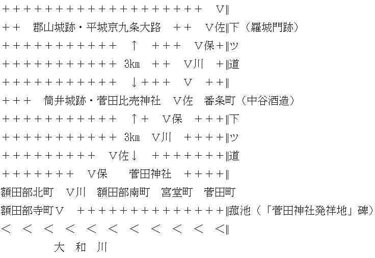 大和郡山市筒井町1440には菅田比売(すがたひめ)神社があり、その南3キロ、大和郡山市八条町619に菅田神社があります。菅田神社の南が天理市二階堂北菅田町と南菅田町、それに大和郡山市宮堂町です。