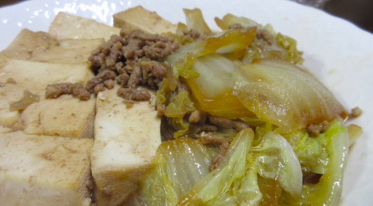 鍋にコップ一杯程度の水を張り挽肉を投入。箸でほぐしてバラバラになったら白菜を投入。濃口醤油を入れ、上に豆腐を載せて10分ほど煮ればできあがり。酒のアテですので醤油の量はやや多めにするのがポイントです。食べてみて味が薄ければ上から醤油を掛ければ良いでしょう。もう一つのポイントは煮た後やや時間を置き、食べる直前に再度ひと煮立ちさせれば白菜にも豆腐にも味が沁みます。私は15分置いてからひと煮立ちさせました。